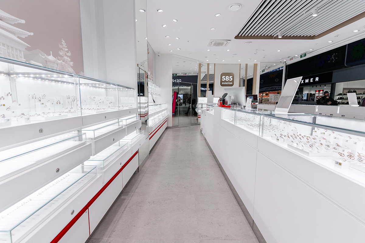 Проект для ювелирной сети 585 ЗОЛОТОЙ на улице Щеголева, 1 в г. Истра — это пример того, как продуманное торговое оборудование помогает бренду сохранять узнаваемый стиль даже за пределами крупных торговых центров.
