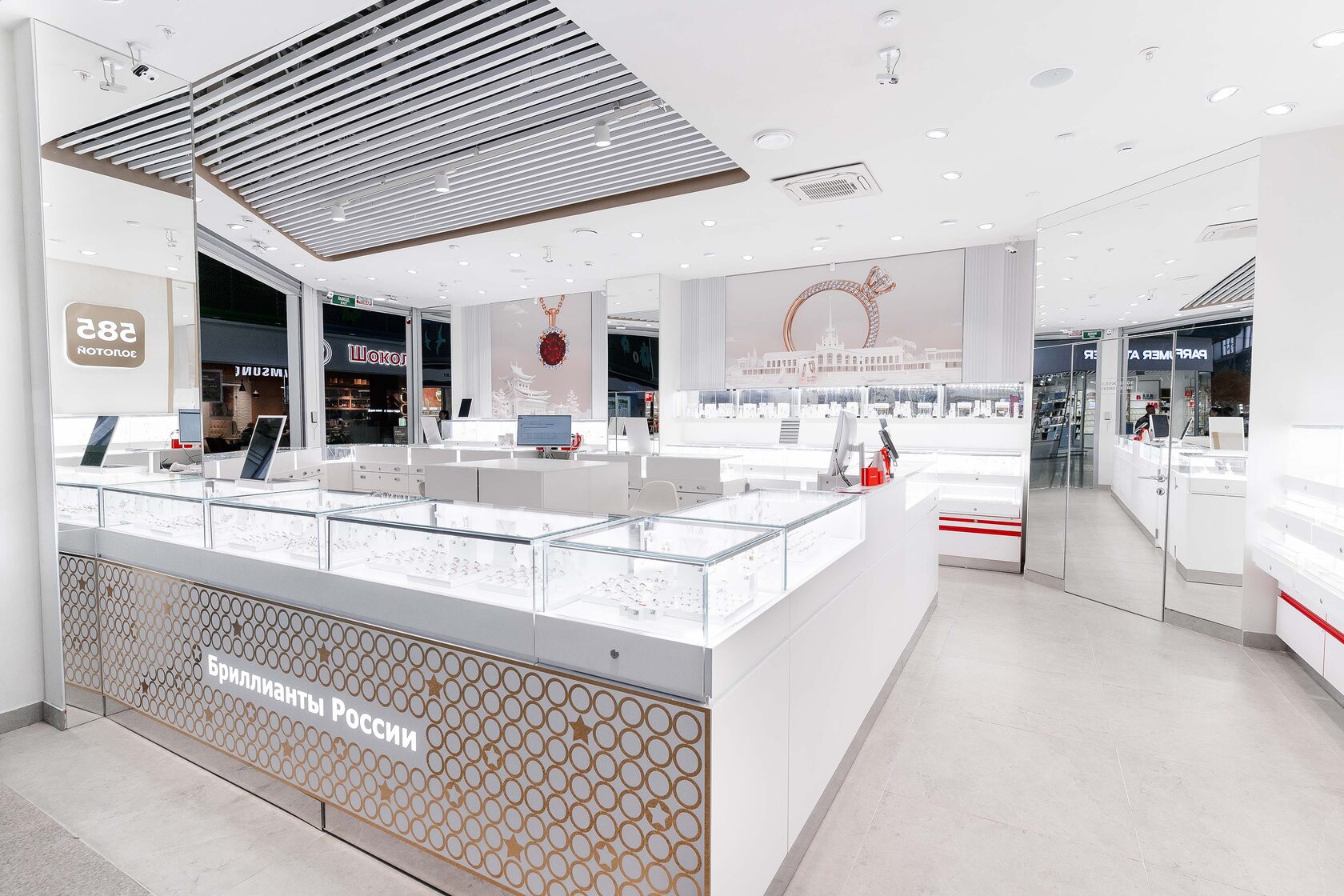 Новый магазин 585 Золотой в ТЦ «Эй, Маркет» (г. Воскресенск) — ещё один успешно реализованный проект нашей команды Интерьерные решения. Мы создали современное и визуально привлекательное торговое пространство, где каждая деталь подчёркивает премиальность ювелирного бренда.