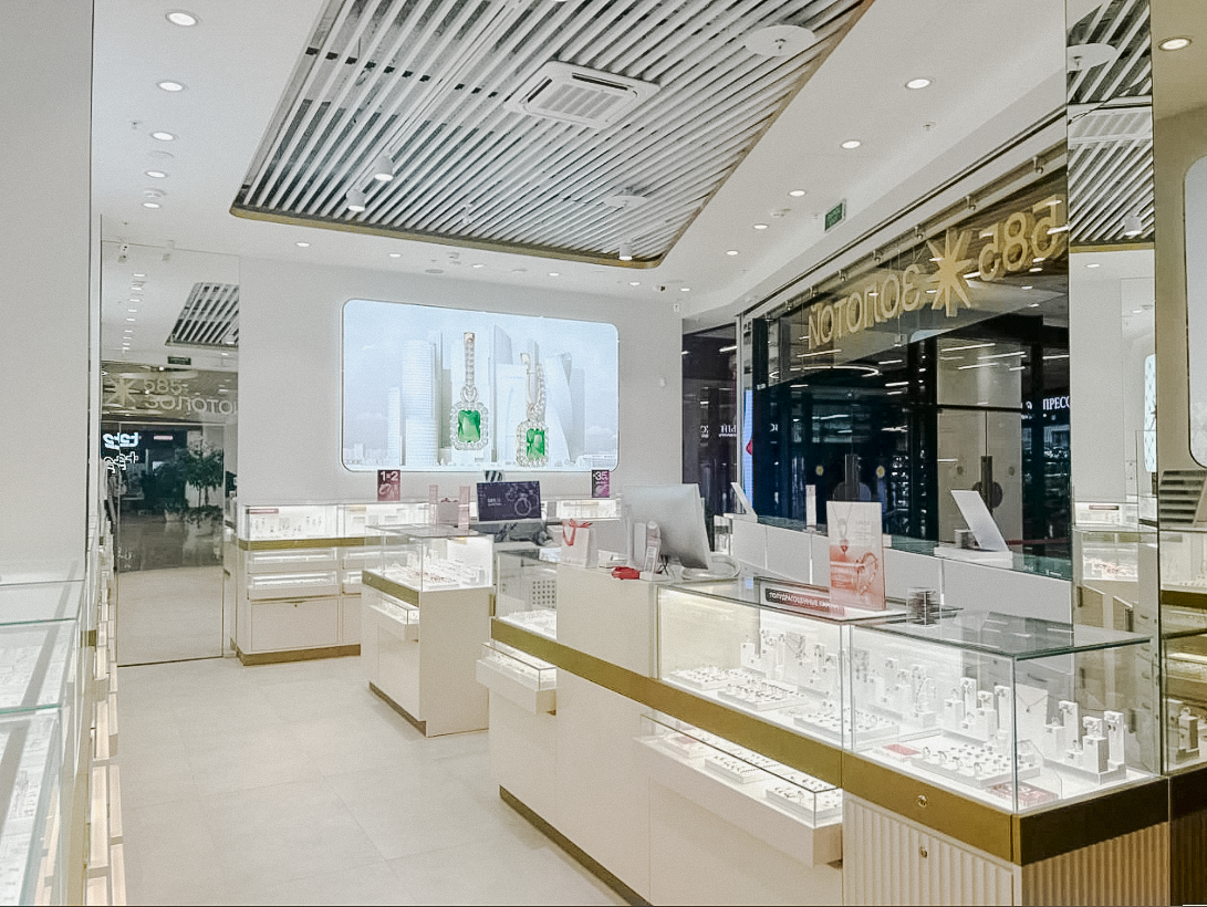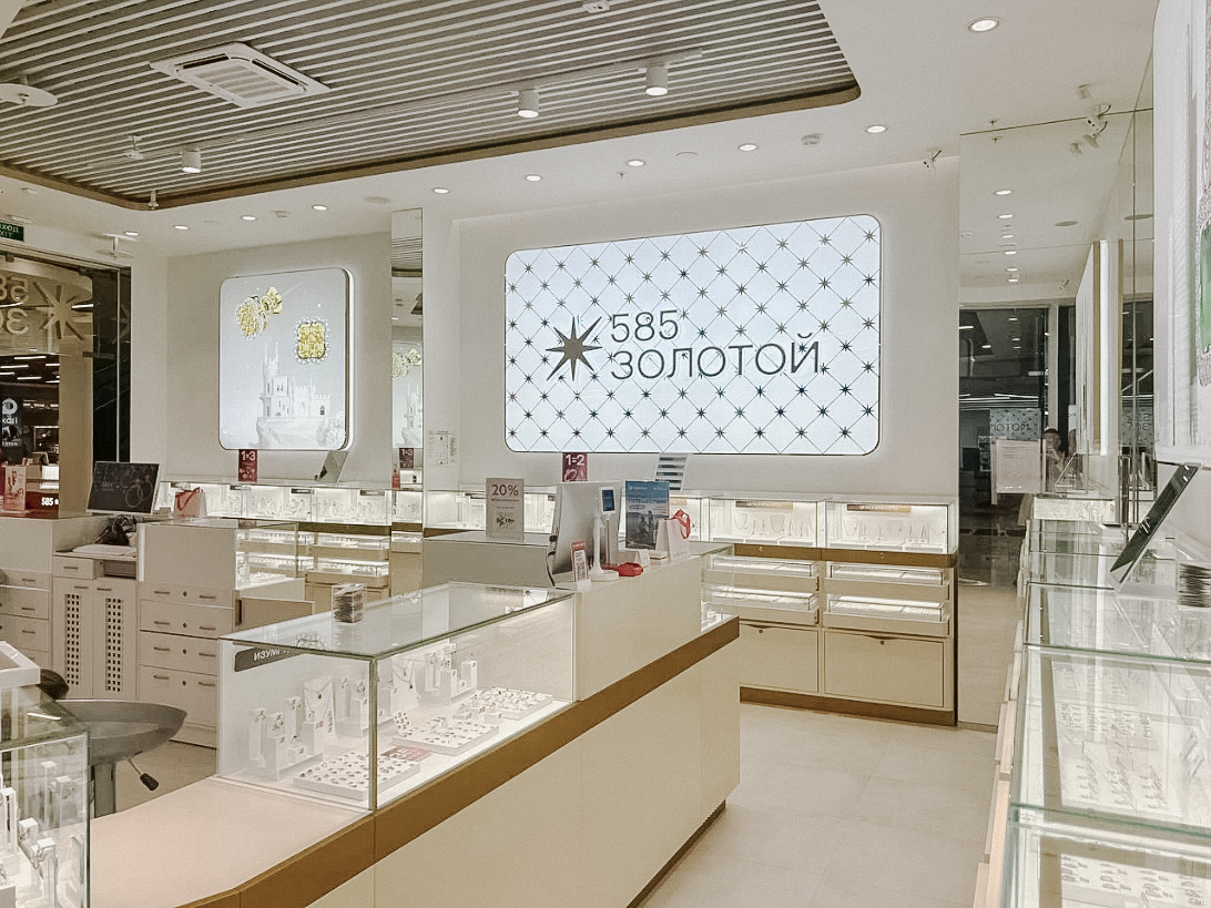 Проект был реализован в срок, что позволило заказчику оперативно открыть новую торговую точку и начать работу с клиентами. Новый салон 585 Золотой в Москве станет центром притяжения для ценителей ювелирного искусства, предлагая широкий ассортимент украшений высокого качества.