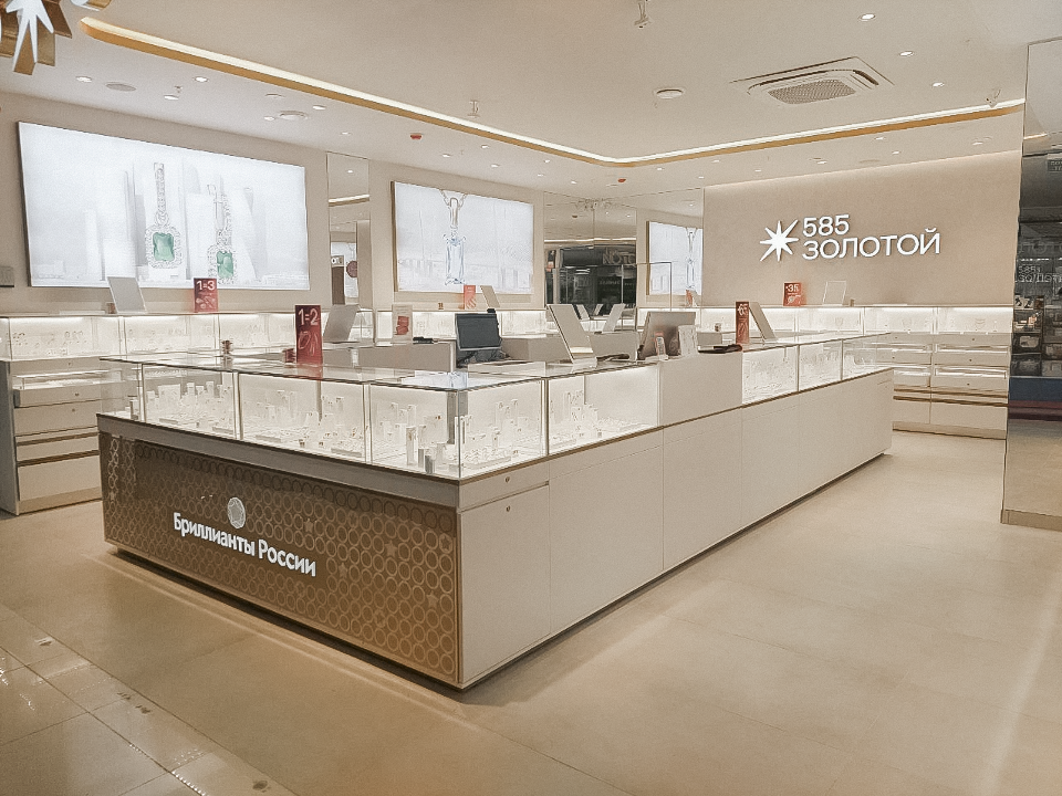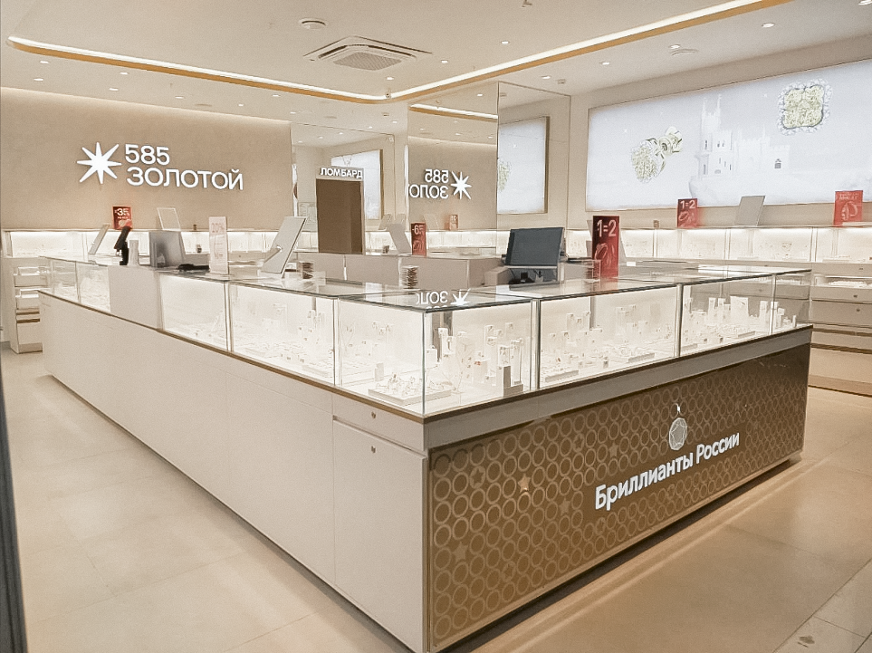 Салон 585 Золотой в ТЦ «Петровский» теперь представляет собой современное, стильное и функциональное пространство, способствующее повышению продаж и привлечению новых клиентов. Проект демонстрирует профессионализм компании «Интерьерные решения» в создании премиальных торговых пространств.