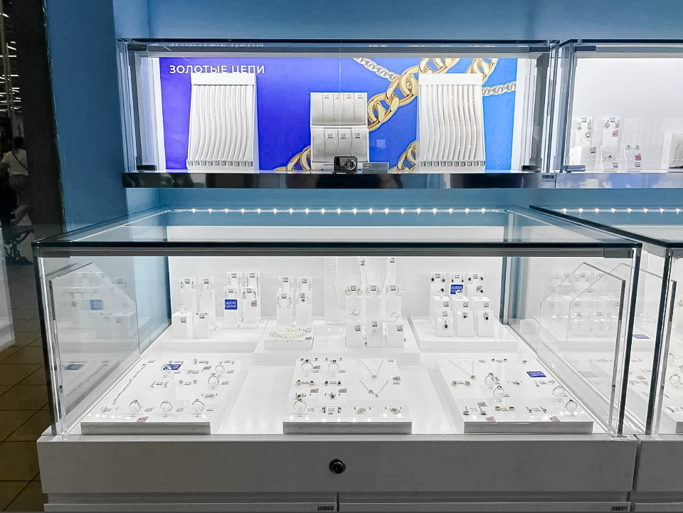 Проект выполнен в фирменной стилистике бренда: чистые линии, лаконичный дизайн, LED-подсветка и качественные материалы подчёркивают премиальный образ ювелирной продукции.