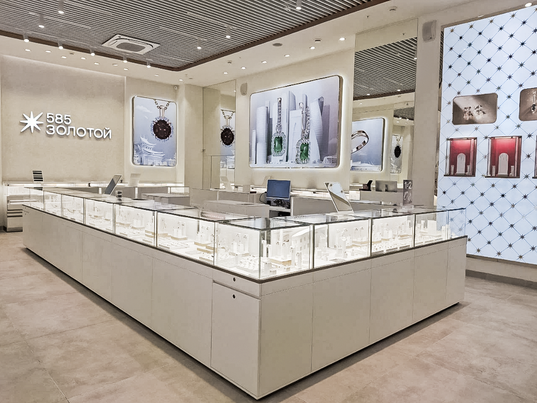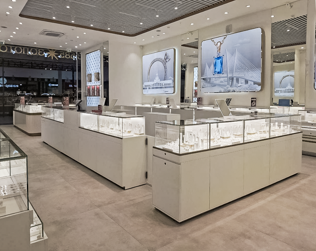 - Функциональность и красота: интерьер подчёркивает статус премиальных украшений и делает их максимально эффектными для посетителей.